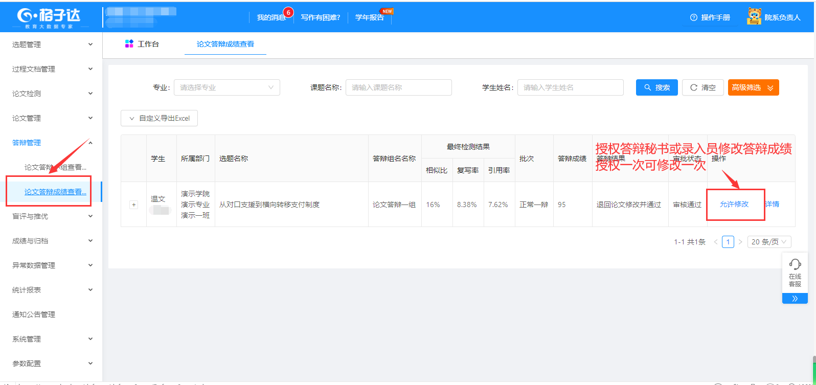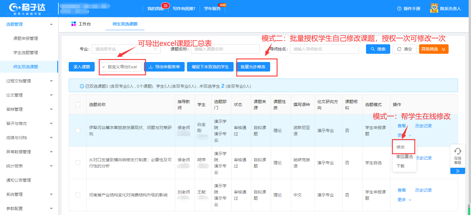 师生双选课题:展示学院所有已经确定师生关系并通过审核的课题,授权修改课题。