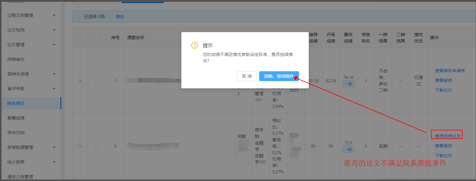 2.推荐优秀论文。如果推荐的论文不满足院系推优条件会弹出提示,否则直接弹出推优表。填写信息后点击提交即可。