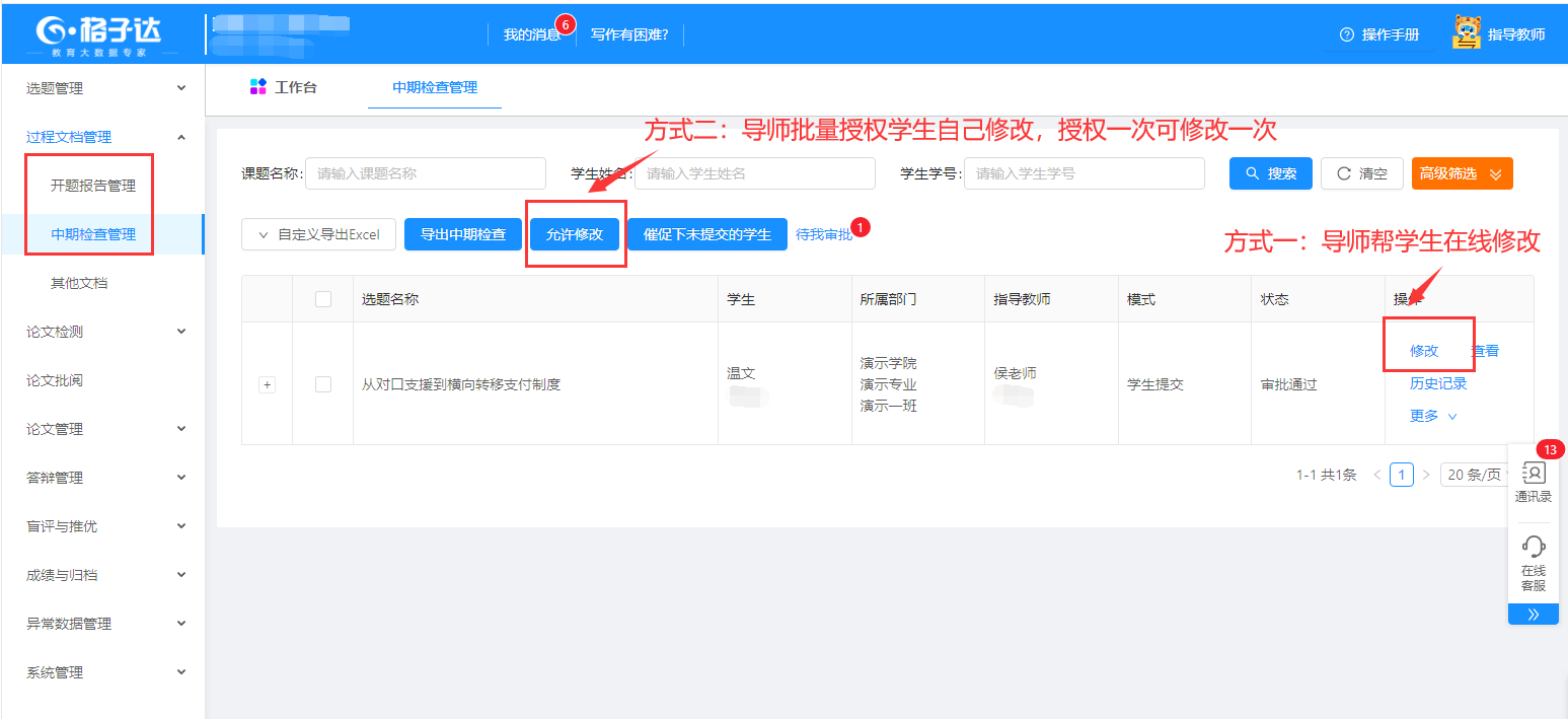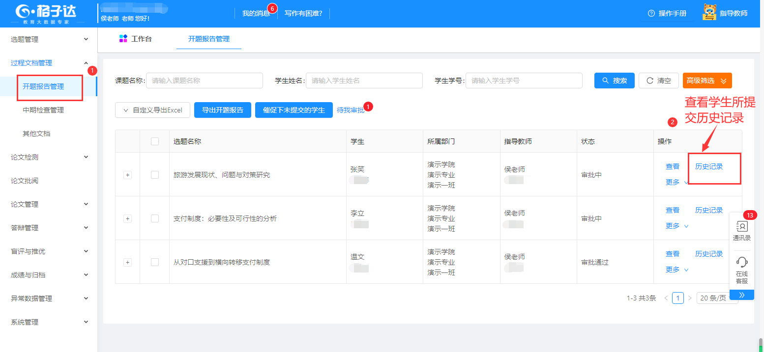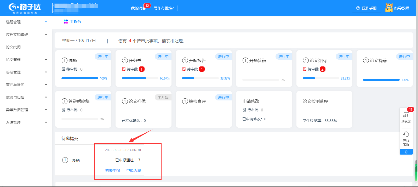 导师进入工作台,查看与审批学生提交的课题、开题报告、论文等。