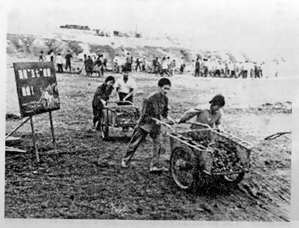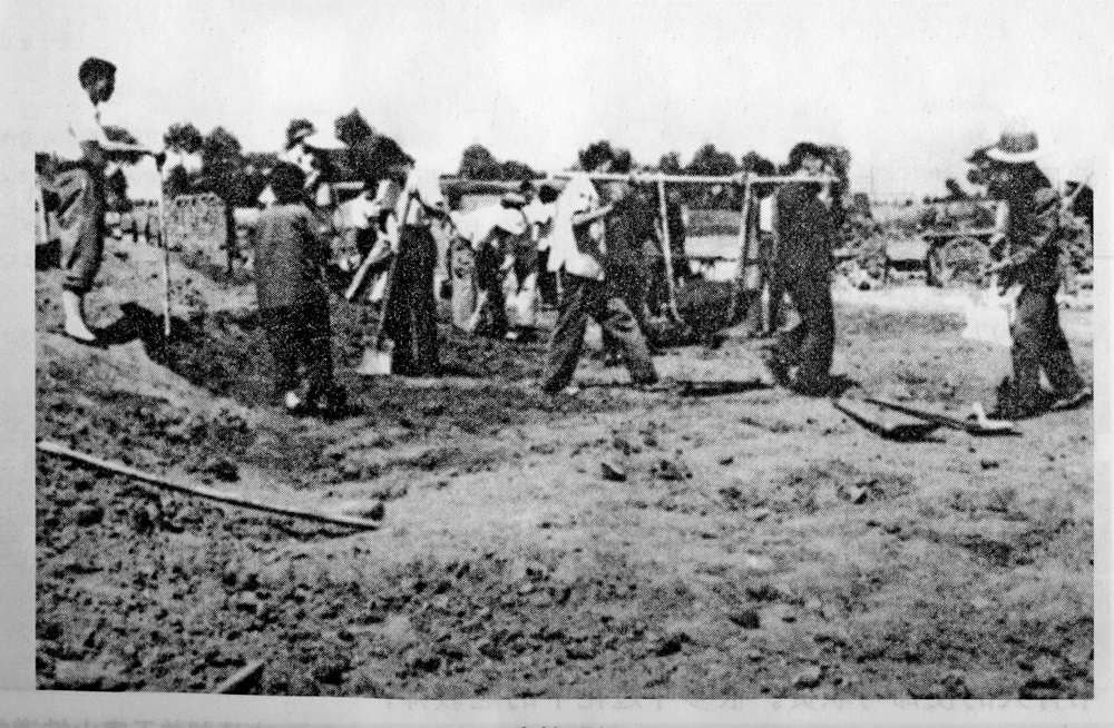 1964年底,经中央批准,清华大学、华东化工学院、北京大学、南京大学迁出部分专业,分别到四川绵阳、四川自贡、陕西汉中、湖南常德建立分校。图为清华大学绵阳分校师生在平整场地