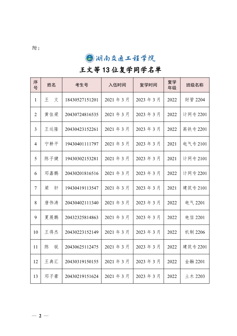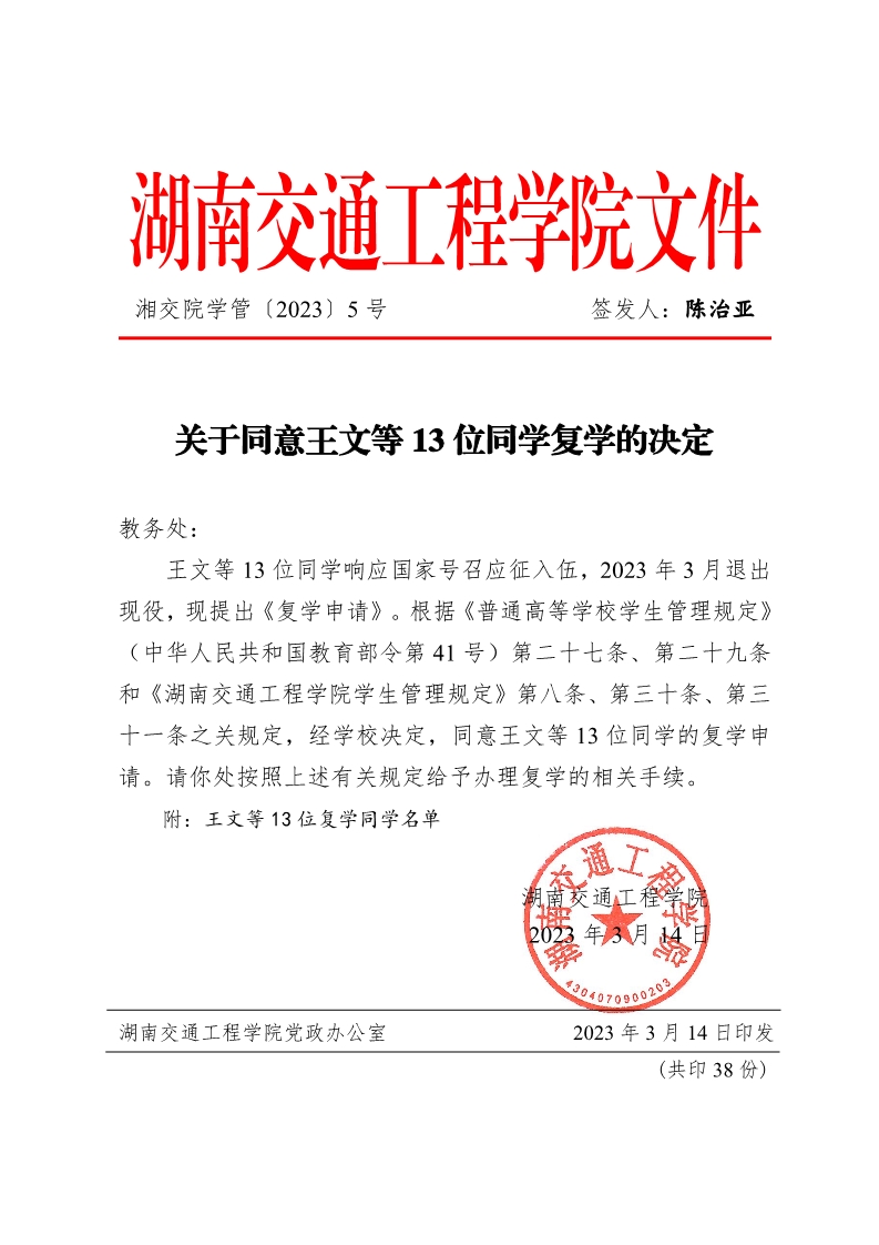 关于同意王文等13位同学复学的决定(湘交院学管〔2023〕5号)