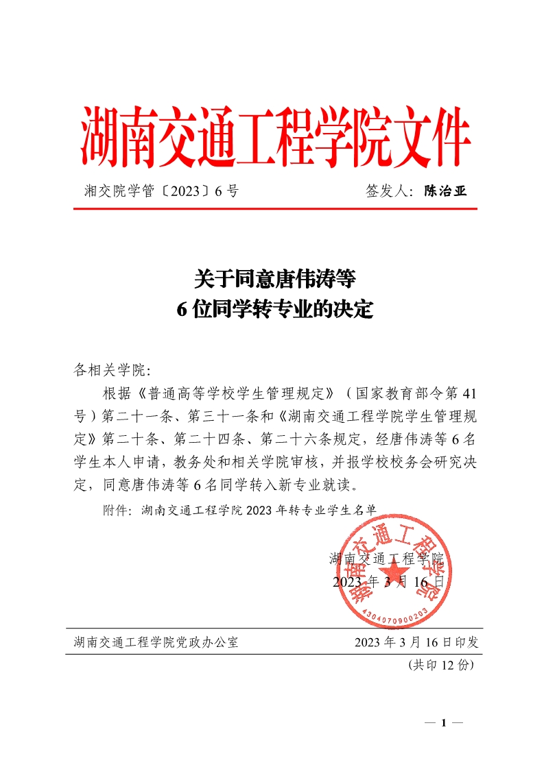 关于同意唐伟涛等6位同学转专业的决定(湘交院学管〔2023〕6号)