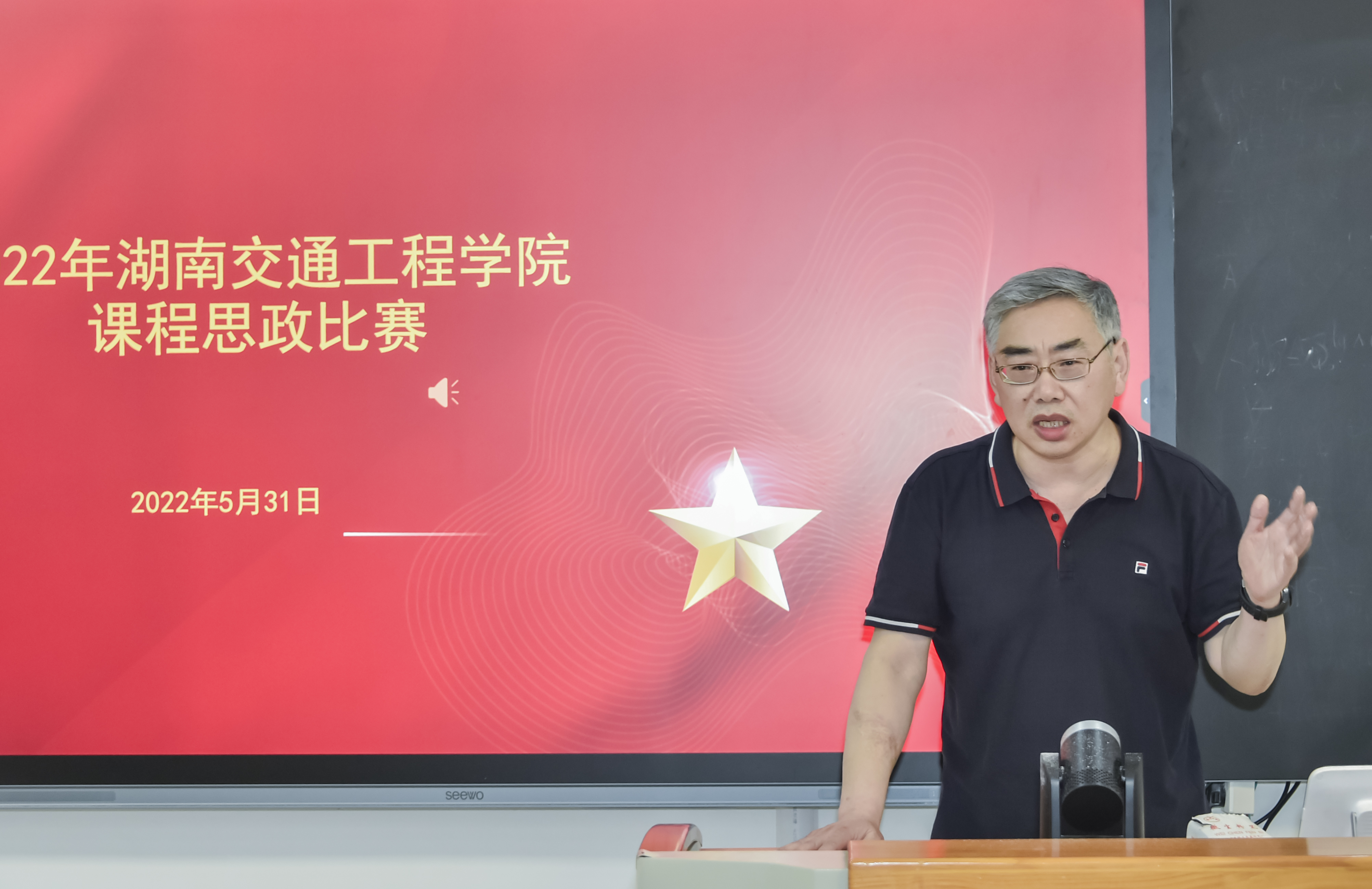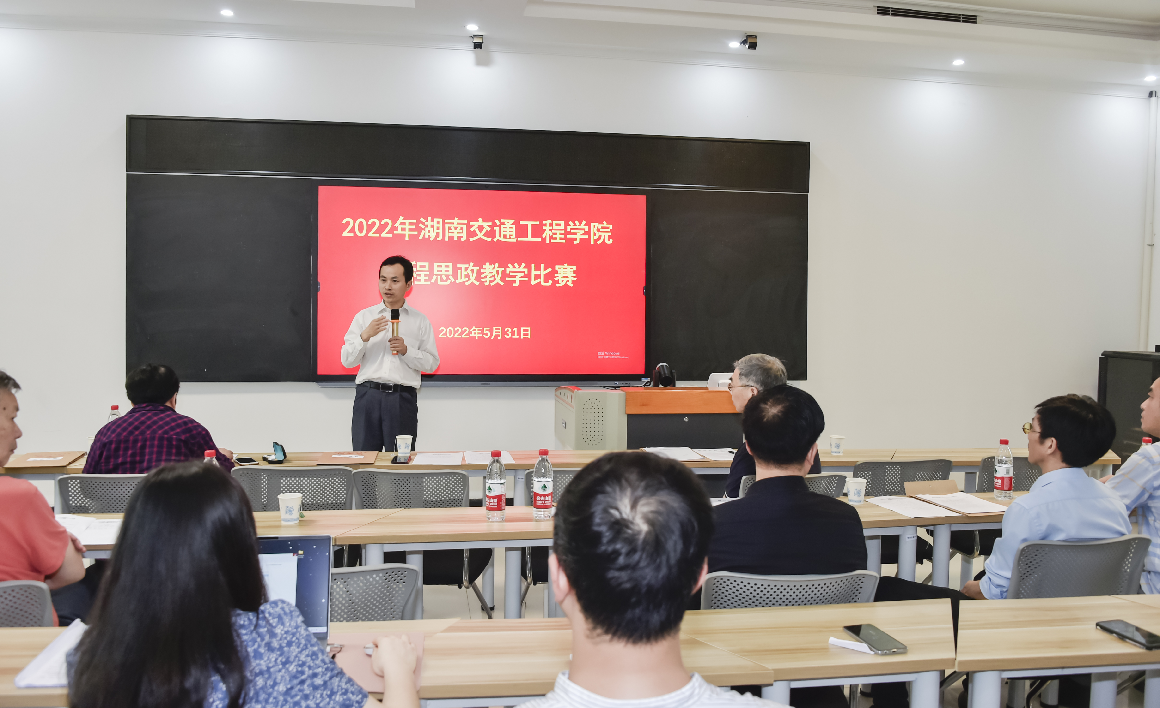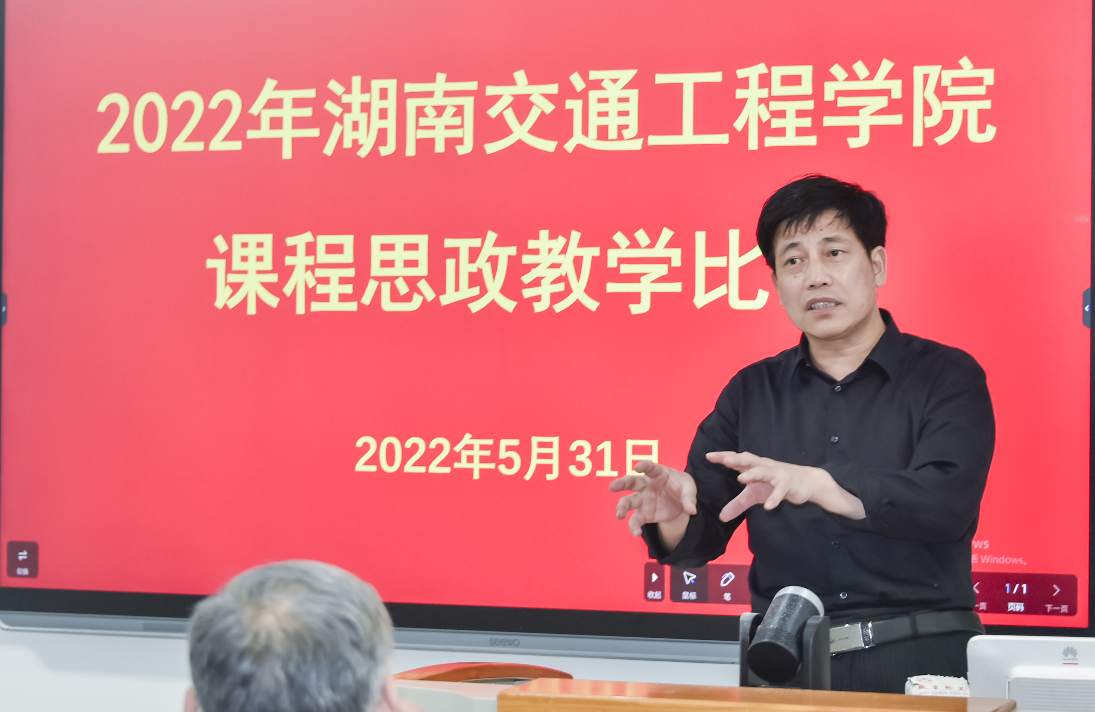 本网讯(通讯员 王海娥  记者  赵红深  摄影  李建华)为贯彻落实国家《关于深化新时代学校思想政治理论课改革创新的若干意见》和《高等学校课程思政建设指导纲要》文件精神,落实立德树人根本任务,高质量推进以“课程思政”为目标的课堂教学改革,使各类课程与思想政治理论课同向而行,全面提升beat365教师课程思政教学能力,5月31日,学校在航母三楼教师发展中心举行2022年课程思政教学比赛决赛暨省级选拔赛。党委书记刘文君、名誉校长刘平娥、副校长樊晓平,教务处处长曹中一,副处长黄玲娟、王海娥,马克思主义学副院长沈飚、交通运输工程学院副院长涂宇、机电工程学院副院长杨启正、经济管理学院副院长王冰、人文与艺术学院副院长刘彪、教师发展中心副主任吴广平,副教授肖美玲、黄志萍担任特邀评委。比赛由党政办副主任霍志玮担任主持人。
