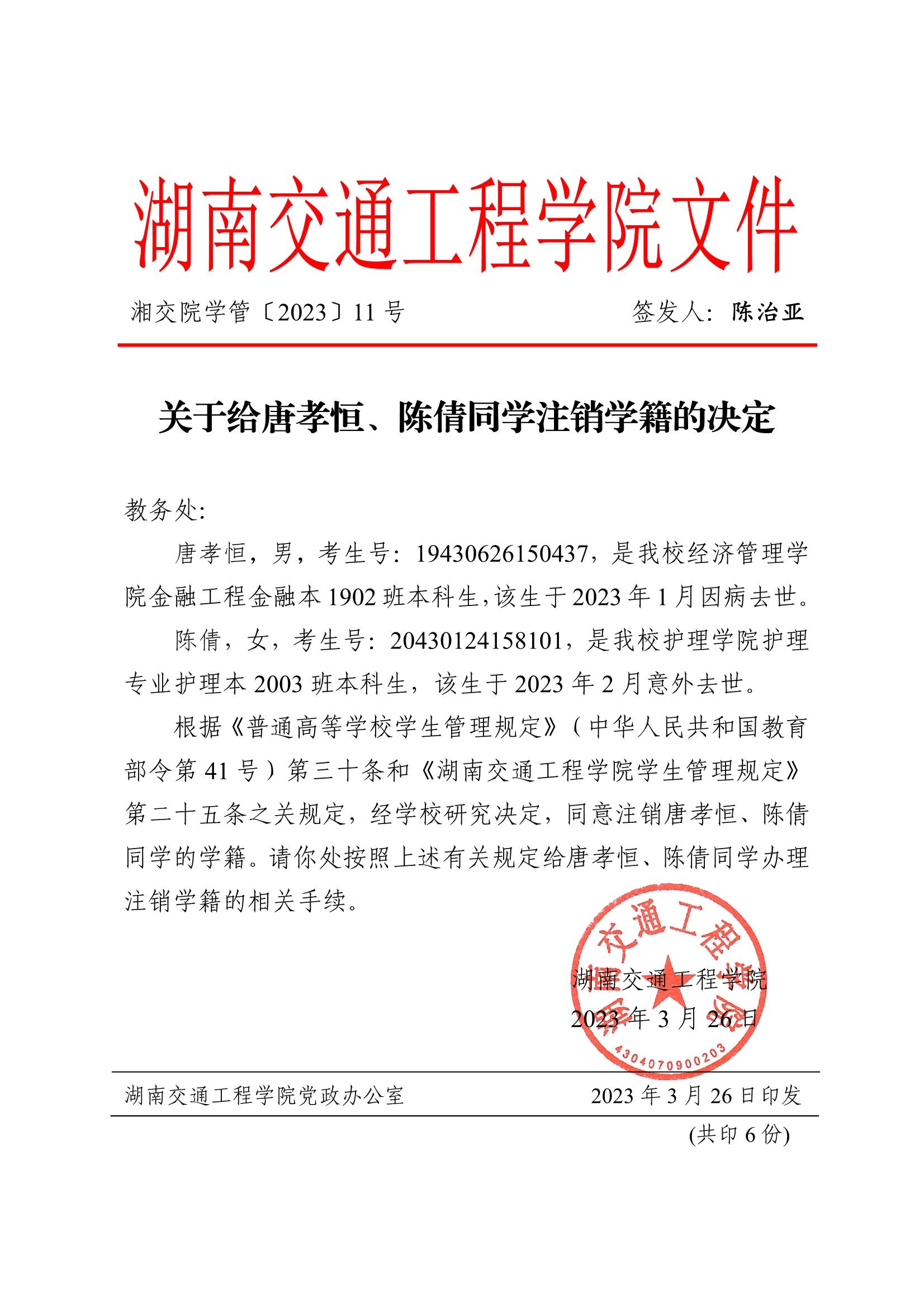 关于给唐孝恒陈倩同学注销学籍的决定(湘交院学管〔2023〕11号)