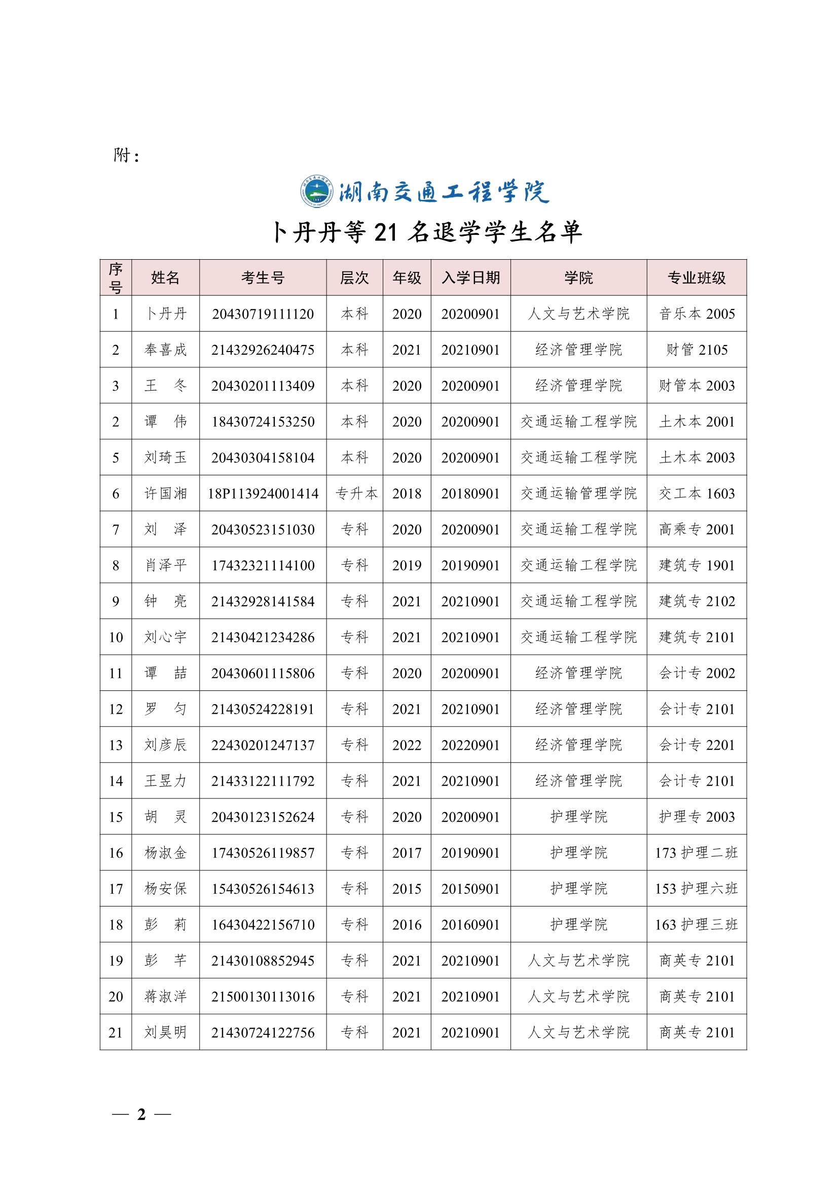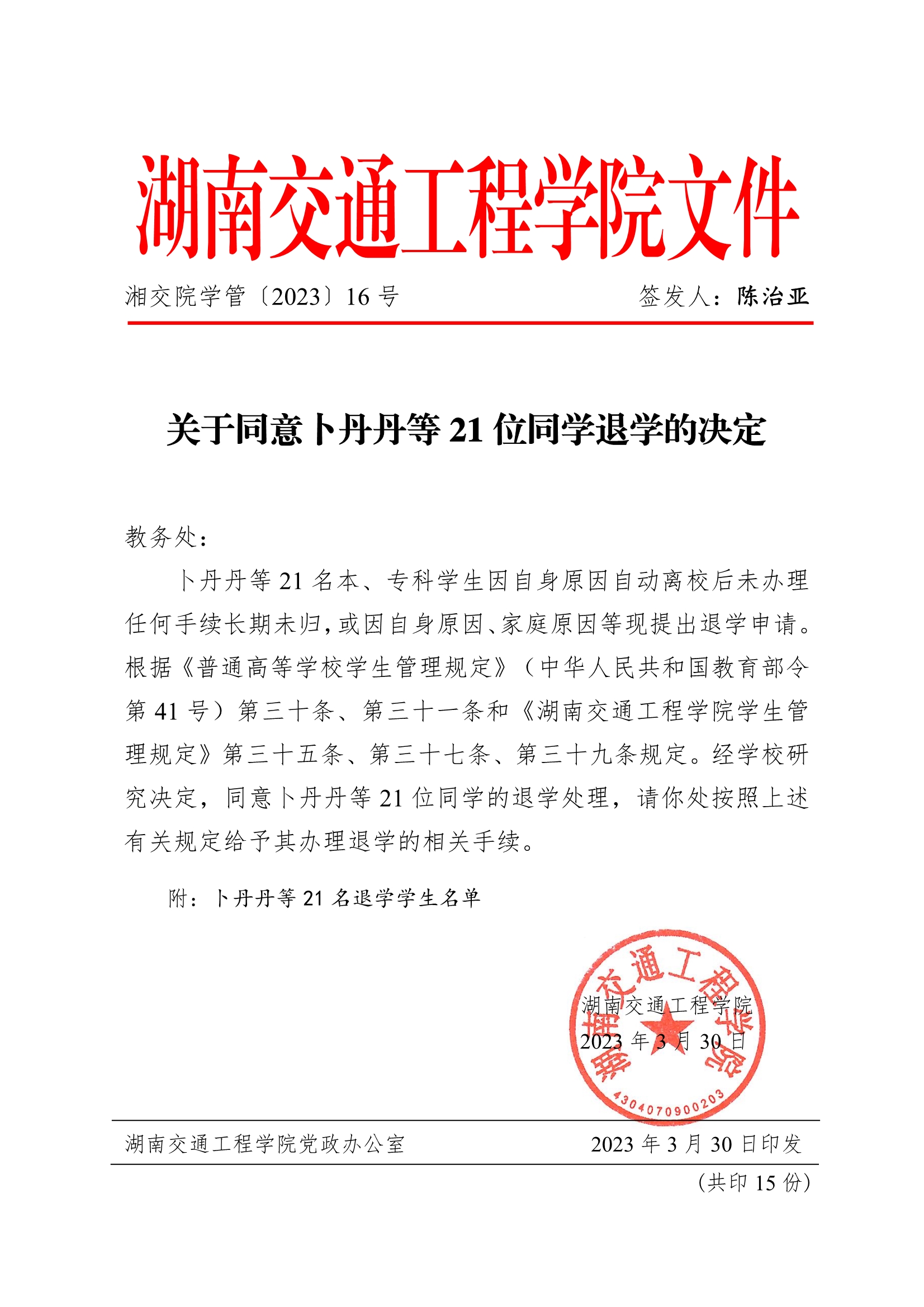 关于同意卜丹丹等21位同学退学的决定(湘交院学管〔2023〕16号)