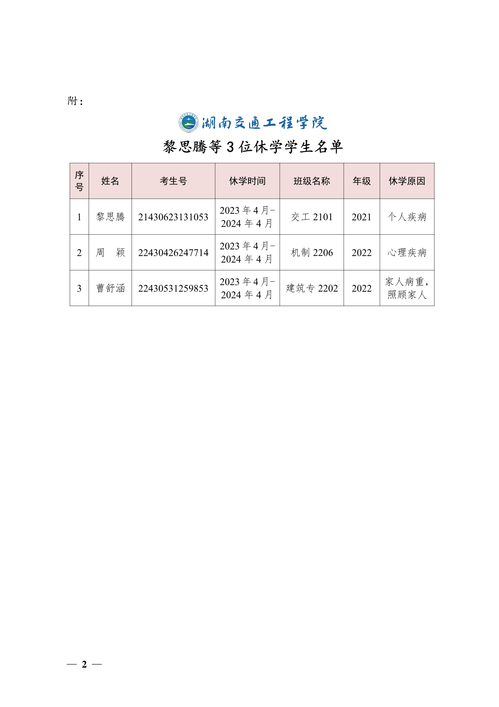 关于同意黎思腾等3位同学休学的决定(湘交院学管〔2023〕18号)