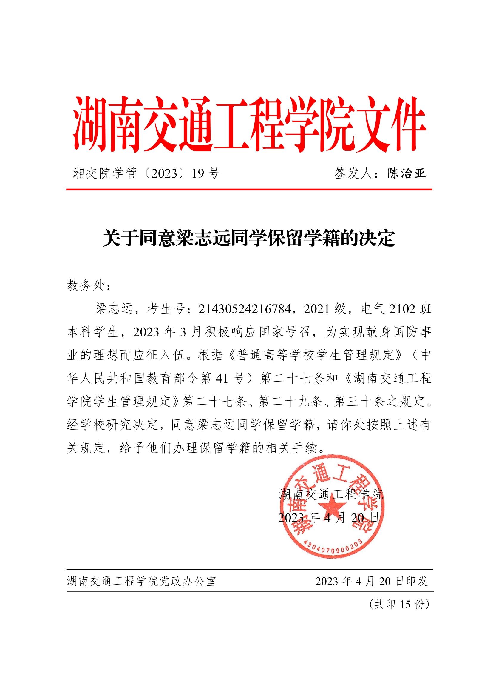 关于同意梁志远同学保留学籍的决定(湘交院学管〔2023〕19号)