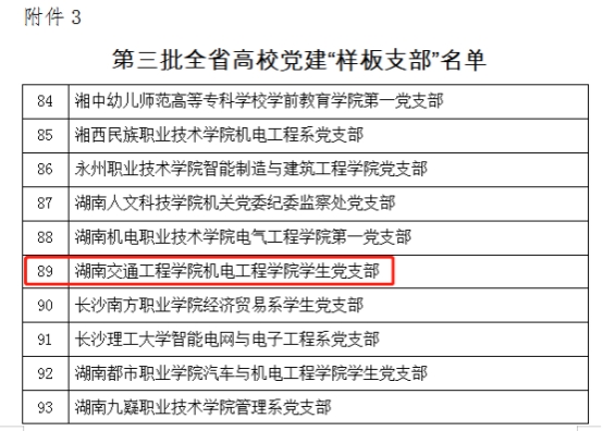 2022年,中共湖南省委教育工委发布了《关于做好全省高校党组织“对标争先”建设计划第三批项目评选和高校“双带头人”教师党支部书记工作室建设工作的通知》,经过中共湖南省委教育工委组织的推荐、评审、公示等环节,beat365机电工程学院学生党支部成功入选“全省高校党建样板支部”。