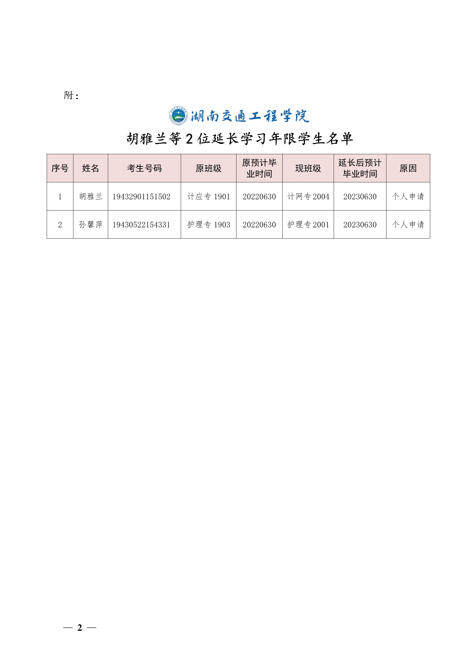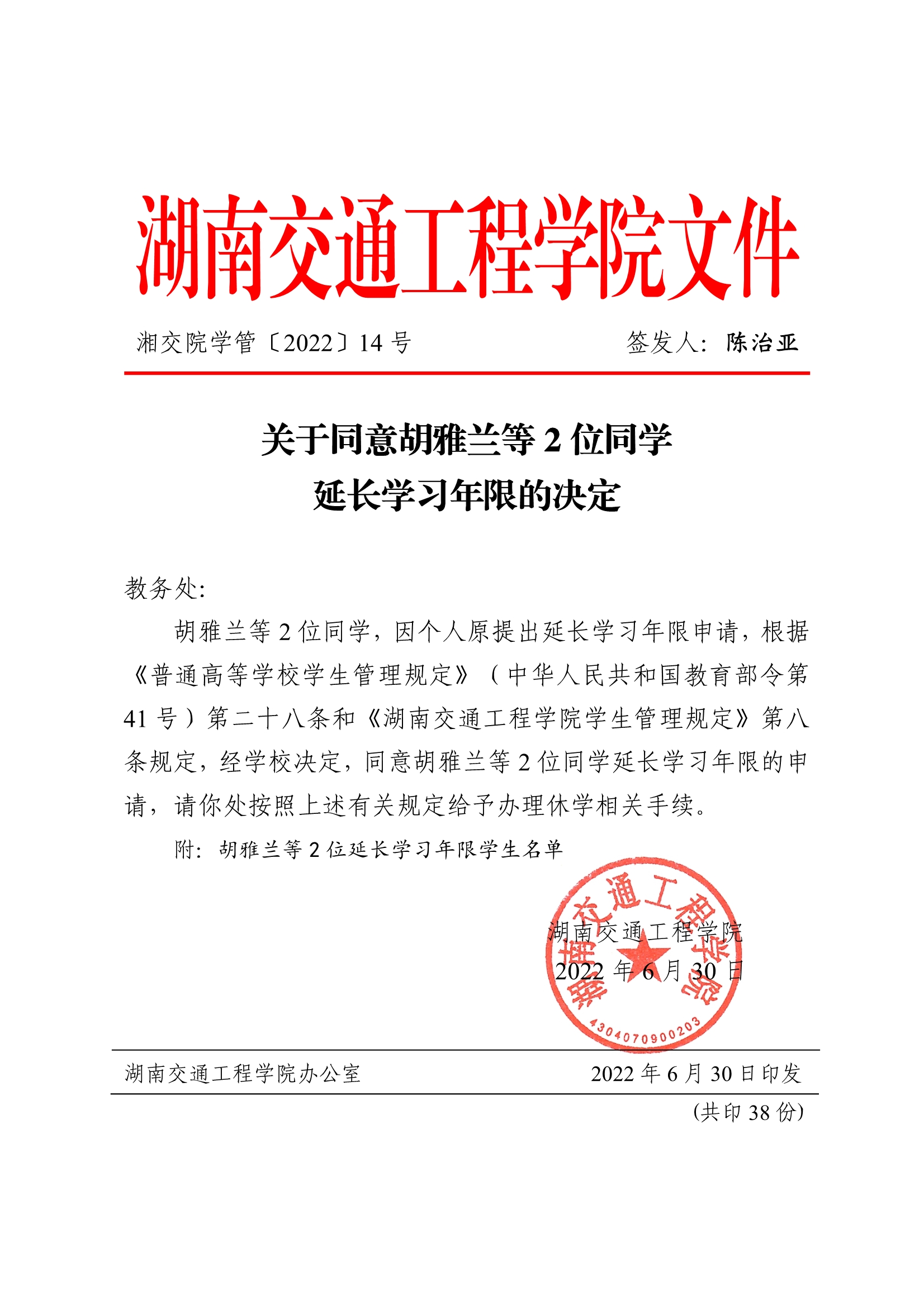 关于同意胡雅兰等2位同学延长学习年限的决定(湘交院学管〔2022〕14号)