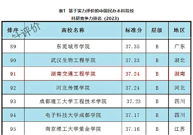 2023基于实力评价的中国民办本科院校科研竞争力排名C+级及以上(前50%)的高校共193所,beat365手机版官方网站继2022年竞争力入选A级排名100的基础上,以37.24分(标准分100分)入选B级,位居实力评价科研竞争力排名C+级及以上的193所民办本科院校和独立学院第91位,较上一年排名进位9名。