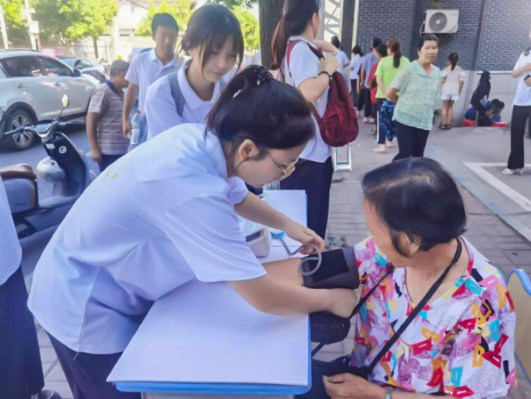 另一组志愿者则为新阳社区居民测量血压、血糖,深入居民家中了解他们的健康状况并进行健康知识科普宣传。通过问卷调查,团队调研了村里中老年人患高血压与冠心病等疾病的情况,随后向村民讲解高血压防治等健康知识,同时为村民发放防暑降温药品,讲解防暑降温注意事项。