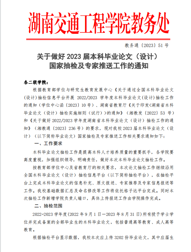 关于做好 2023 届本科毕业论文(设计) 国家抽检及专家推送工作的通知