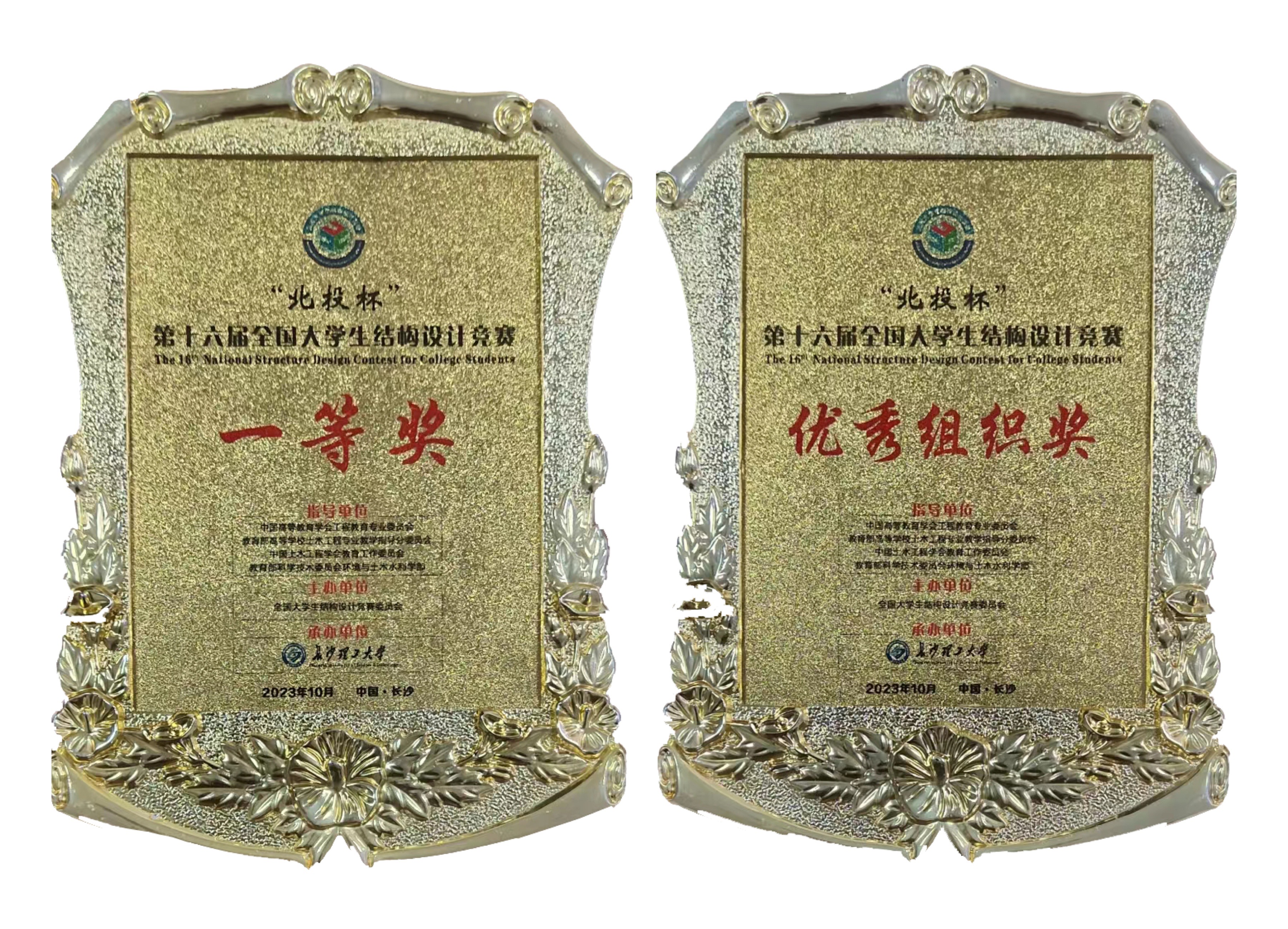本次参赛,得到了学校、学院的高度重视与大力支持,自今年3月份发布赛题以来,交通工程学院成立了指导老师团队,多次集体研究赛题,精心组织校赛和省赛,悉心开展集训,于7月份夺得省赛一等,凭借省分区赛一等奖成绩顺利获得国赛入场券。进入决赛后,指导教师继续带领参赛选手努力进取、顽强拼搏,三个月备赛期几乎全程无休,从模型结构形式到每一个结点细节处理,都经过无数次反复尝试、改进、创新,最终参赛团队历时16个小时现场制作两跨四车道模型《凌霄塔》,凭借巧妙的作品设计、精湛的制作工艺、突出的结构性能、稳定的现场发挥,以自重129.5g、承受住三级多工况竖向移动荷载、撞击荷载的优异成绩取得国家一等奖,被组委会授予优秀组织奖。