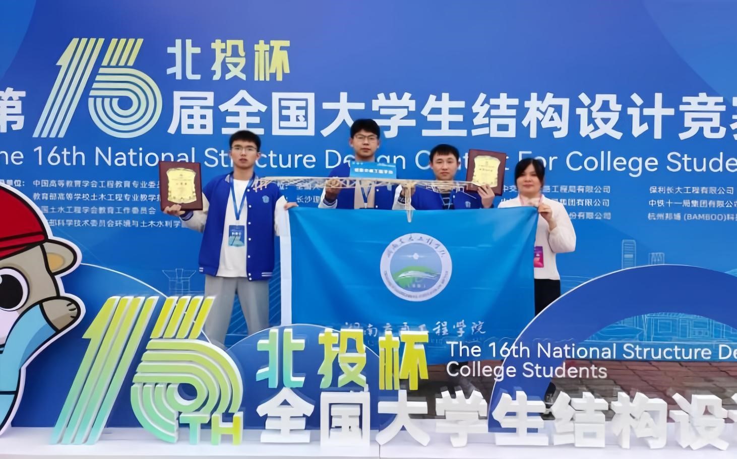 本网讯(通讯员 郑明)10月26日至29日,“北投杯”第十六届全国大学生结构设计竞赛在长沙理工大学举行。我院郑明、涂宇老师指导的20级土木工程专业学生段传忠、吴晨鹏、杨长波组成的参赛队伍,历经四天现场激烈角逐,喜获全国一等奖,获优秀组织奖。