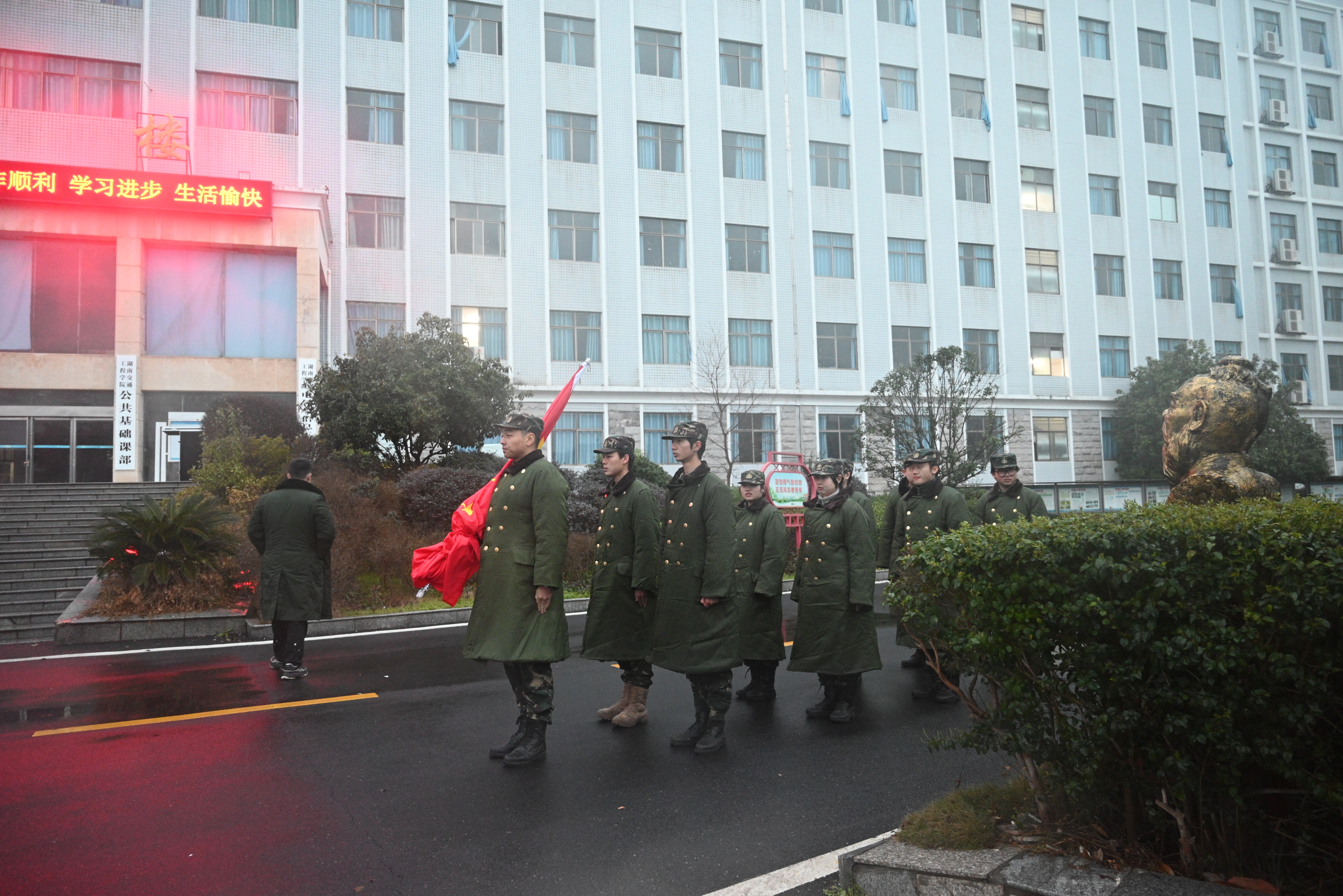 本网讯(通讯员 李水华 摄影 大学生记者团杨欣怡)金龙昂首唤春归,万象启新耀东方。2月26日上午7时05分,学校在毛泽东铜像广场举行2024年春季学期第一次升旗仪式。校党委副书记冯良贵、副校长余孟辉等校领导与各二级学院党总支书记、辅导员及校、院两级团学干部代表齐聚国旗下,以踔厉奋发的姿态、笃行不怠的决心,满怀信心开启新学期的学习与生活。