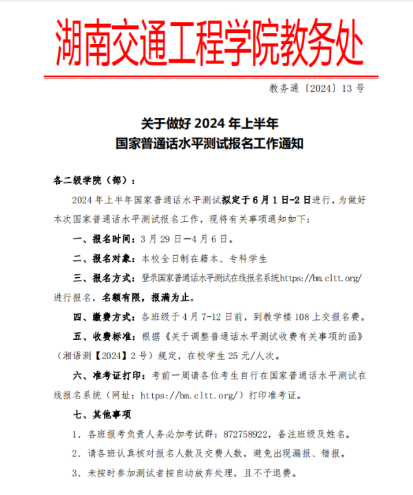 关于做好2024年上半年普通话等级考试报名工作通知
