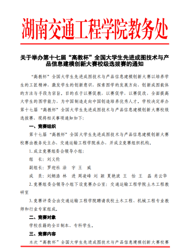 关于举办第十七届“高教杯”全国大学生先进成图技术与产品信息建模创新大赛校级选拔赛的通知