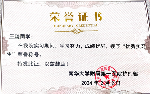 从实习中来,到实践中去,优秀实习生取得的优异成果充分体现了他们的三个主要特点:第一,踏实肯干,吃苦耐劳;能够把理论知识和临床实践相结合,踏实工作,努力做到规范化护理,全心全意为患者提供优质服务。第二,综合素质强,爱岗敬业;严格遵守科室制度,发现问题能及时解决和分析。第三,高效工作,待人真诚;工作中服从指挥,不怕苦,不怕累,有较强的求知欲,想病人所想,急病人所急,树立了良好的医德医风。