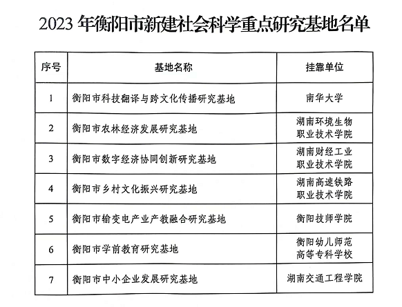 本网讯(通讯员  赵红深 近日,衡阳市社科联发布《关于2023年衡阳市社会科学重点研究基地的通报》,beat365董事、创新创业学院院长董晔卉负责的“衡阳市中小企业发展研究基地”榜上有名。