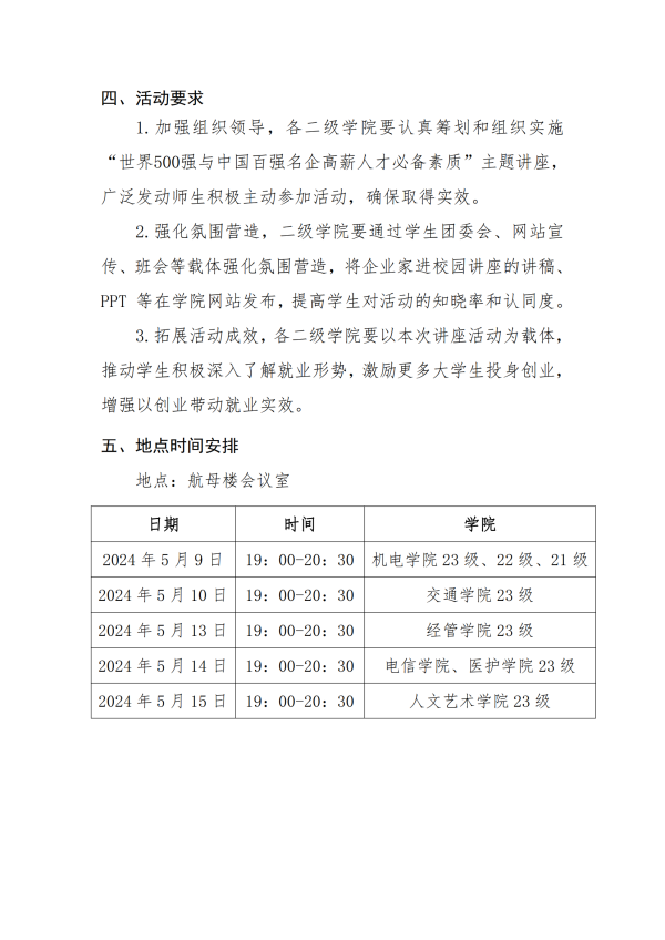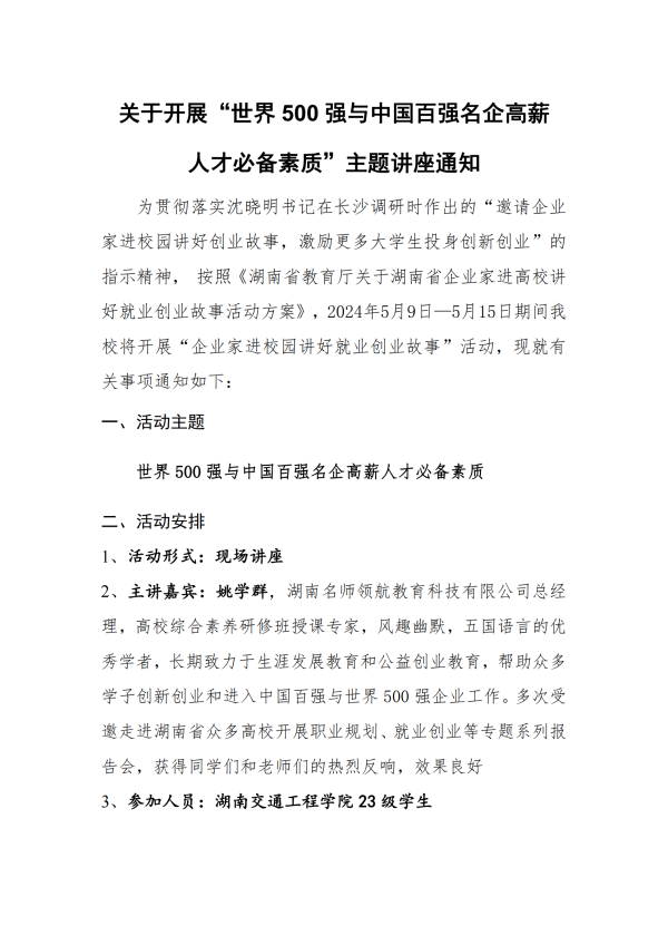 关于开展“世界500 强与中国百强名企高薪 人才必备素质”主题讲座通知