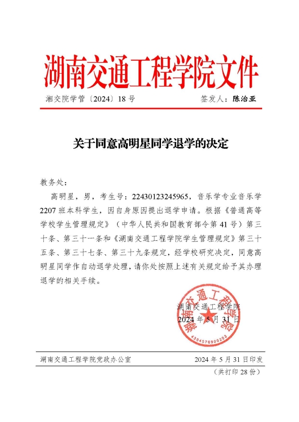 关于同意高明星同学退学的决定(湘交院学管〔2024〕18号)