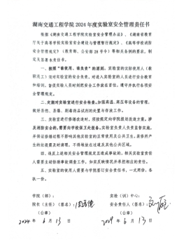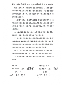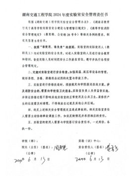 会上,根据学校文件要求,实行实验(实训)室安全责任书“三级”承诺制,在校-院级(彭文武—罗迎社)已完成安全责任书签订的基础上;学院-实验室(中心)(罗迎社—周孝德)签订了安全责任书;实验室(中心)-实验员(周孝德—各个实验员)签订了安全责任书。
