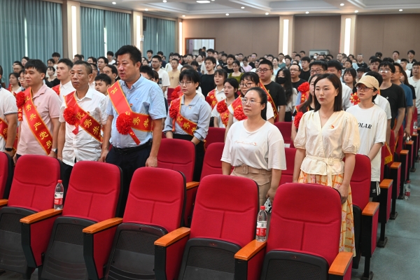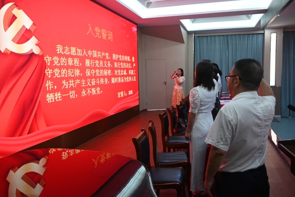 伴随着庄严的国歌声,学校庆祝建党103周年暨“七一”表彰大会正式开始。首先,组织统战部副部长李佩佩领衔新党员面向党旗庄严宣誓、老党员重温入党誓词。