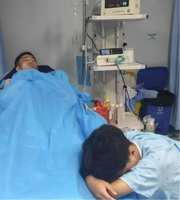 在同学叶轩丞、刘涛、肖明同学热心帮助下,张尹超同学迅速被送往南华附二医院急救室抢救,刘建军老师和三名同学在急救室内陪护了整整一夜,没有休息。由于开学以来的持续高温,医护学院的各位领导及老师高度重视学生身体健康,时刻关注学生身体情况,为每一位新生的身心健康保驾护航。