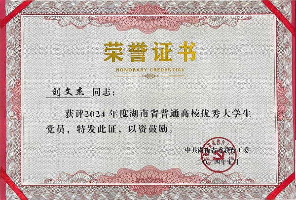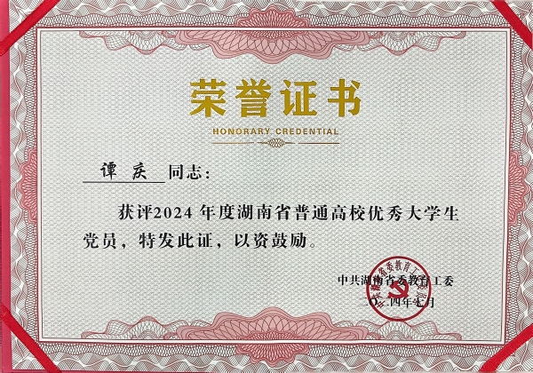 近日,中共湖南省委教育工作委员会发布通知,授予140名同学“2024年度湖南省普通高校优秀大学生党员”荣誉称号,beat365机电工程学院2020级机械设计制造及其自动化专业学生刘文杰、经济管理学院2020级国际经济与贸易专业学生谭庆名列其中。