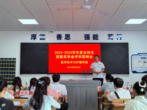 为切实做好2023-2024学年国家奖学金评选工作,充分发挥国家奖学金的示范引领作用,彰显优秀学子的榜样力量,医学技术与护理学院9月26日教学楼203教室召开了2023–2024学年度本科生国家奖学金评审答辩会。院长秦晓群、党总支书记邓丽、副院长廖小立、党总支副书记兼团总支书记刘建军、教学干事老师张怡春、学生干事老师陈文蓉、教研室主任、全体辅导员、学生代表参加了此次会议。会议由刘建军副书记主持。