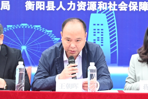 王朝晖代表衡阳市人力资源和社会保障局讲话。他指出,就业是最大的民生,高校是培养人才的主阵地,做好毕业生就业工作,责任重大,意义深远,不仅有利于发挥毕业生聪明才智实现人生价值,而且有利于促进社会和谐稳定,希望参会的各用人单位,着眼于现实需要和长远发展,站在人才战略的高度,积极吸纳人才、储备人才,为本单位的发展充实力量。