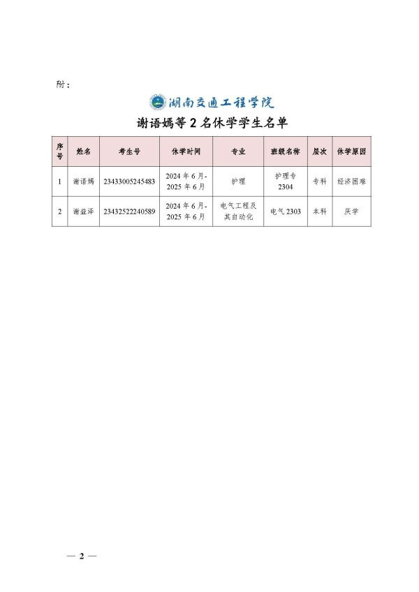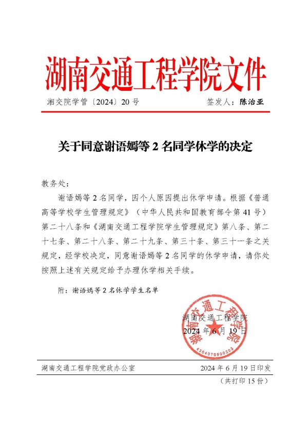 关于同意谢语嫣等2名同学休学的决定(湘交院学管〔2024〕20号)