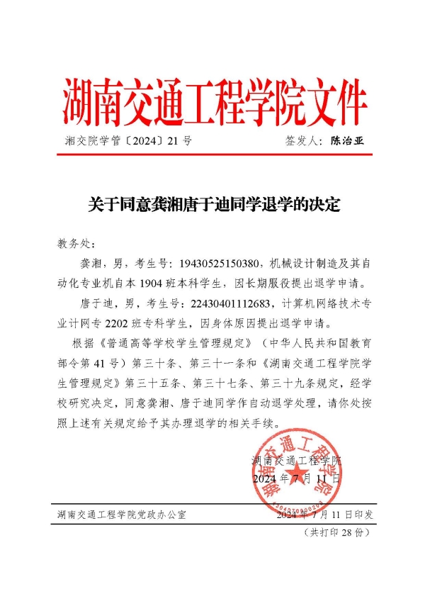 关于同意龚湘唐于迪同学退学的决定(湘交院学管〔2024〕21号)