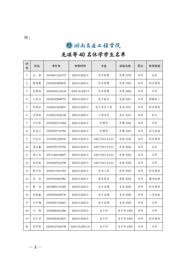 关于同意龙琪等40名同学休学的决定(湘交院学管〔2024〕24号)