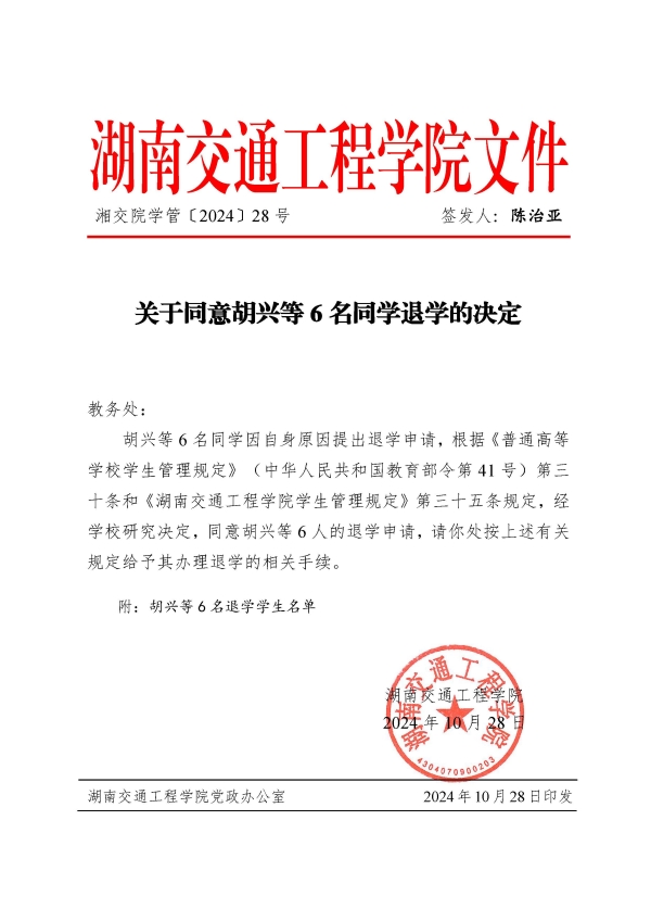 关于同意胡兴等6名同学退学的决定(湘交院学管〔2024〕28号)