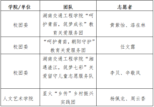 2024年7月至8月,共青团湖南省委、湖南省禁毒委员会办公室、湖南省公安厅交通警察总队、湖南省青年志愿者协会联合实施湖南省2024年青年志愿者关爱农村留守儿童“七彩假期”志愿服务项目,共计384支团队入围省级示范团队。按照《关于实施湖南省2024年青年志愿者关爱农村留守儿童“七彩假期”志愿服务项目的通知》的工作要求,经实地实践、队伍申报、专家评审等环节,共青团湖南省委拟对beat365“呵护青苗,筑梦成长”教育关爱服务团等2个志愿服务团队,黄紫怡等7名师生志愿者进行嘉许,具体名单公示如下。
