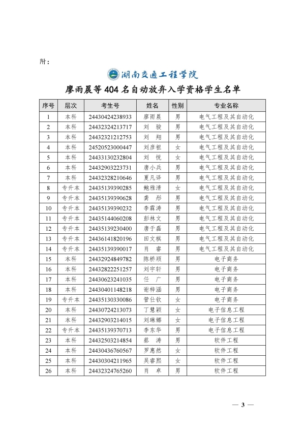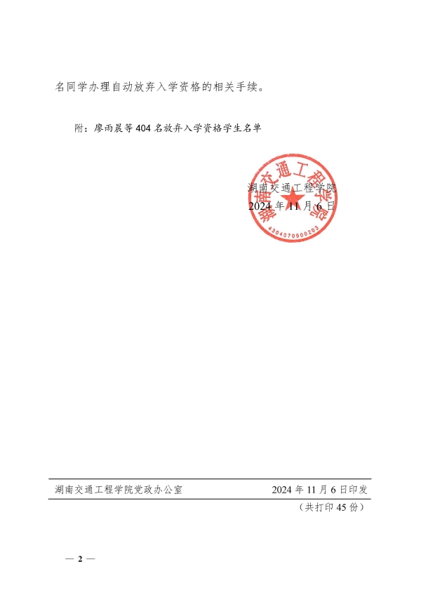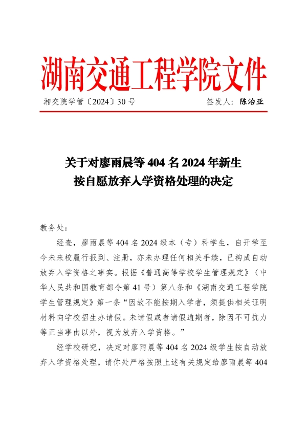 关于对廖雨晨等404名2024年新生按自愿放弃入学资格处理的决定(湘交院学管〔2024〕30号)