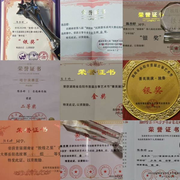 2015年中国教育部教育学会专业委员会举办的“中国梦·青春风采”艺术展示活动金奖;2016年“敦煌之星”一等奖;2017年首届田汉青少年才艺展演活动古筝专业银奖;2021年湖南省岳阳市首届古筝艺术节合奏金奖;2021年第六届“敦煌杯”国际器乐大赛专业组银奖;2022年6月澳港大湾区22届金蛙国际艺术节“芳吟杯”专业组二等奖;2022年7月厦门青少年音乐艺术节专业组银奖;2023年2024年7月湖南省“洞庭杯”专业组一等奖;2024年10月第十五届国际古筝比赛专业组银奖;2024年11月湖南省大学生三独比赛二等奖。