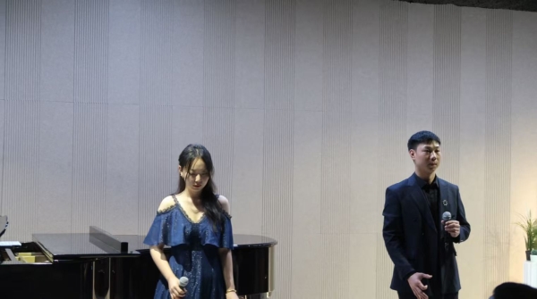 听闻此次文艺联欢晚会,两位新加坡音乐少年方皓正和刘宇正主动请缨参演。方皓正为南洋艺术学院钢琴系一年级学生,刘宇正则是美声唱法初学者。当晚,他们共同演绎了经典意大利声乐作品《我亲爱的》,刘宇正深情演唱,方皓正担任艺术指导。这首歌曲歌词简洁质朴,生动地抒发了对爱情的渴望与哀怨之情。