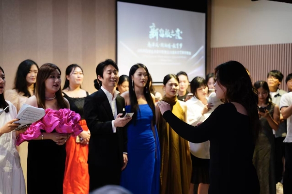 灯光渐暗,舞台上全体合唱演员身姿挺拔,神情庄重。《城南送别》前奏响起,他们张口,歌声如潺潺流水,哀愁与期许交织,编织怀旧画卷。歌声时而轻柔婉转,时而雄浑激昂,演员配合默契,完美展现离情眷恋。指挥欧婷优雅地站在前方,精准掌控节奏,灵动的双手引领音乐起伏。幕后的艺术指导刘怒成精心雕琢细节,凭借深厚造诣提升演出质量。叶子青专注吹奏长笛,悠扬笛声为晚会添诗意,与歌声呼应。在全体演员合唱电影《城南旧事》的主题曲《城南送别》的悠扬歌声中,晚会圆满落幕。这场演出作为中新教育文化交流的生动写照,在全球观众心中留痕,弦歌雅韵也将在教育梦想途中持续回响。