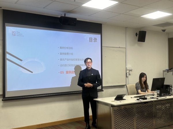 第一组尹世杰老师以《吴青峰与林暐哲版权纠纷案分析》为题,选取极具现实意义的案例深入剖析。他详细介绍了案例背景,清晰阐述了音乐产业版权管理的重要性以及合约细节的复杂性,并着重讲解了签订合约时权益保护策略的制定方法,以及提升版权保护意识、防范法律风险的要点。通过尹老师的精彩汇报,大家对该版权纠纷案及音乐产业版权问题有了深刻认识,此次汇报也成为一次重要的知识产权保护教育交流。