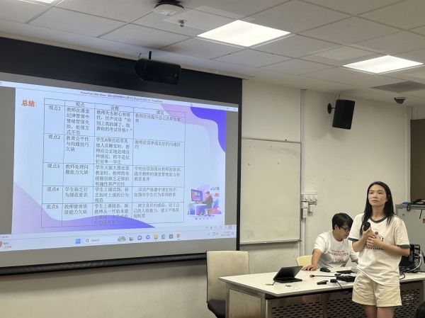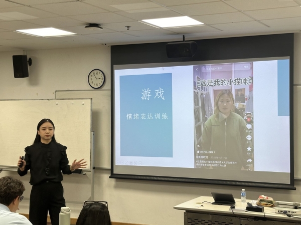 第二组谭林深老师带来互动式教学短课程《舞台语言艺术》的汇报。课程中,学生们深入学习戏剧语言情绪的概念、特点与作用,通过简单的语言节奏和语调变化塑造角色情感,并结合身体表达实现语言、表情与身体情绪的统一。谭老师还精心设计小游戏,充分调动现场气氛,让同学们在轻松愉快的氛围中掌握舞台语言艺术精髓,增强了参与感与实践能力。