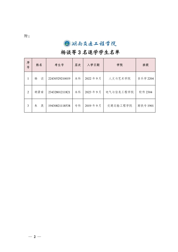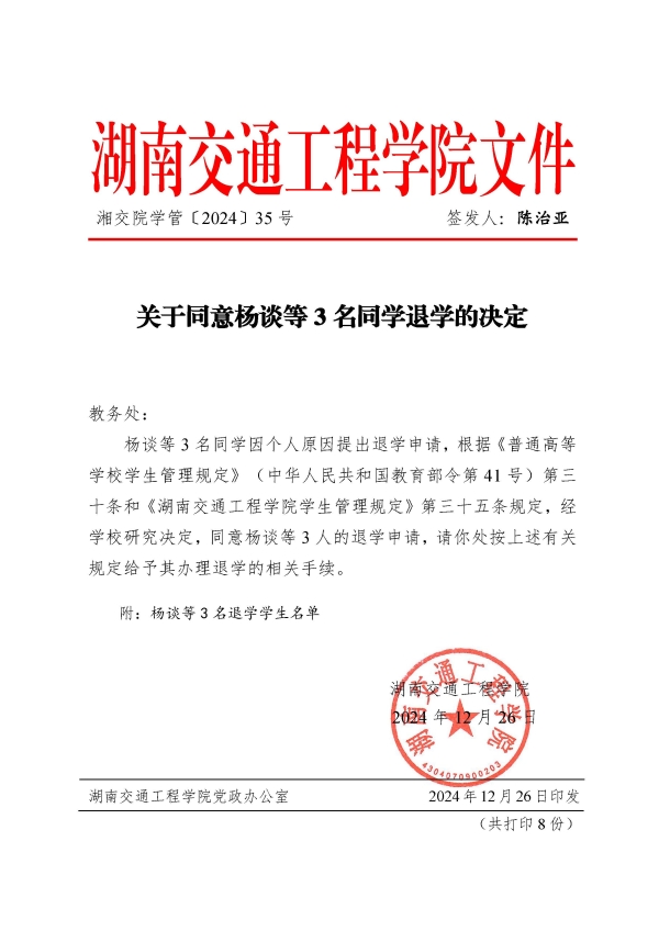 关于同意杨谈等3名同学退学的决定(湘交院学管〔2024〕35号)