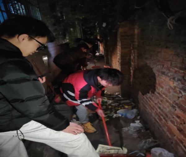 活动中,师生们身着红色马甲,手持铁钳、铲刀等工具展开地毯式清理。面对顽固的胶痕、淤积的落叶和嵌在砖缝中的烟头,学生党员、预备党员、入党积极分子们蹲身俯首细致作业。在搬运废弃实验器材时,交通工程专业学生发挥专业特长,运用简易滑轮装置安全高效地完成重物转移,将课堂知识转化为实践能力。经过2小时奋战,共清运垃圾10余袋,修复破损围栏3处。