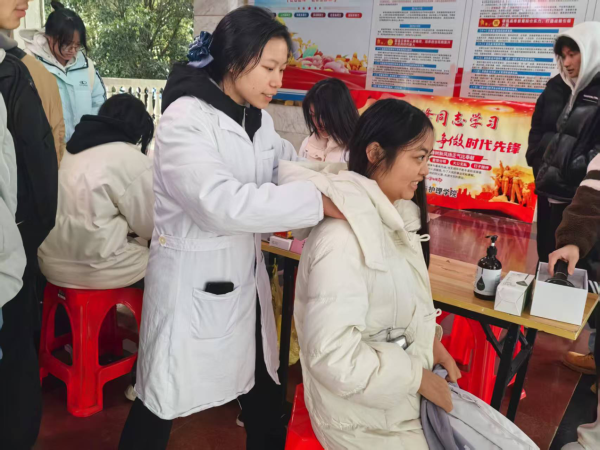 志愿者们早早抵达现场,有序地布置场地,为义诊做好准备工作。随着下课铃声响起,教学楼大厅渐渐热闹起来,来往的师生们被义诊活动和志愿者们热情的招呼所吸引,纷纷驻足参与。在义诊现场,志愿者们充分展现出专业素养和奉献精神。他们耐心地引导师生们进行各项检查,有条不紊地为大家测量血压、检测视力、检查色盲及色弱。此外,还提供了推拿按摩、艾灸等中医特色服务。面对来往师生们的咨询,志愿者们总是耐心倾听,并根据每个人的身体状态提出实用的健康小常识和科学合理的建议,看着来往的师生们一张张笑脸,义诊活动的温暖一定传递到了他们的心里。
