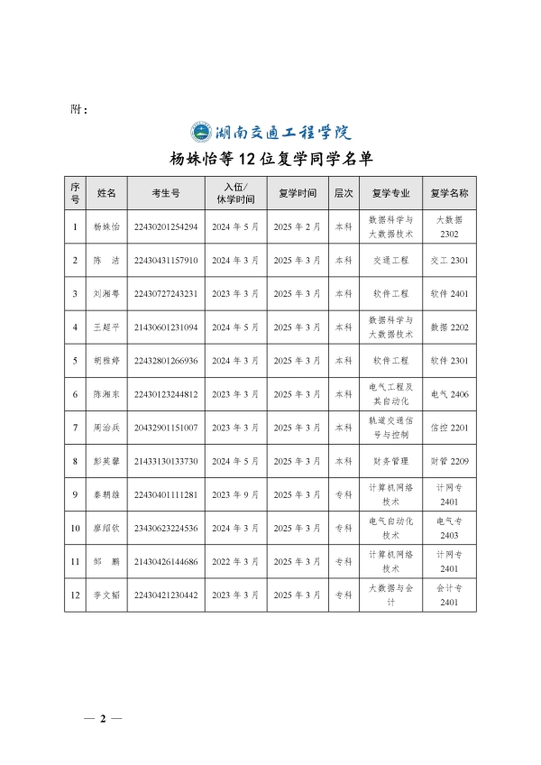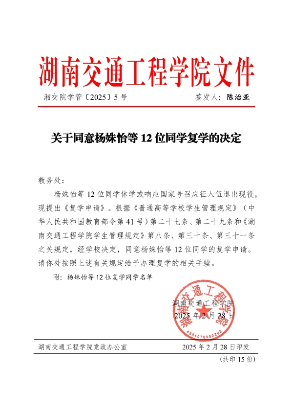 关于同意杨姝怡等12位同学复学的决定(湘交院学管〔2025〕5号)