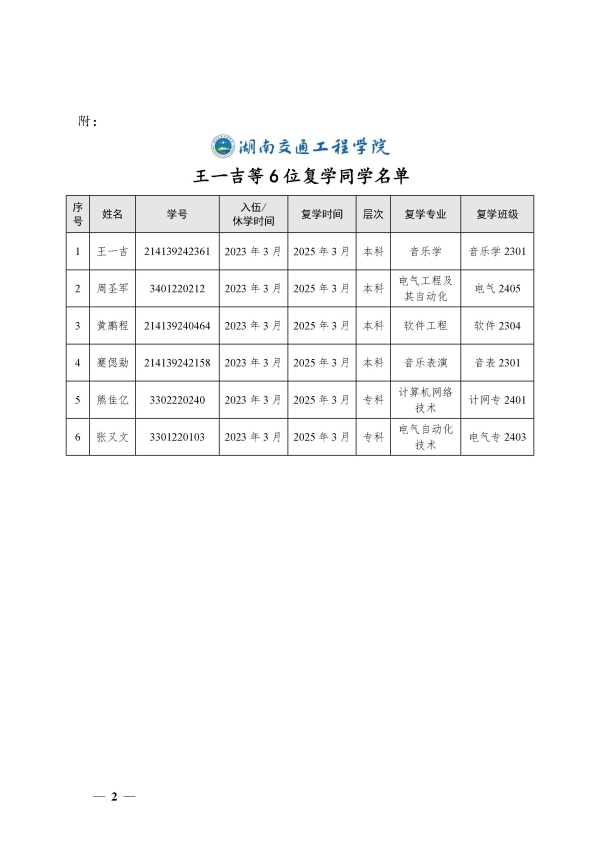关于同意王一吉等6位同学复学的决定(湘交院学管〔2025〕9号)