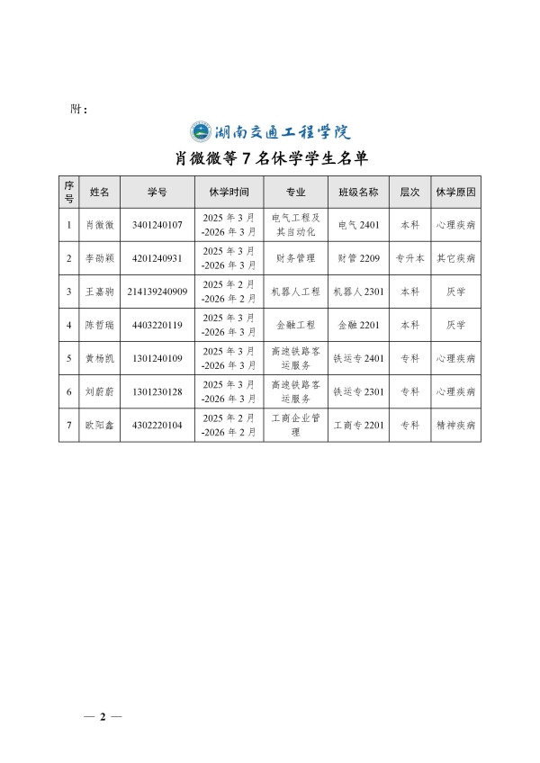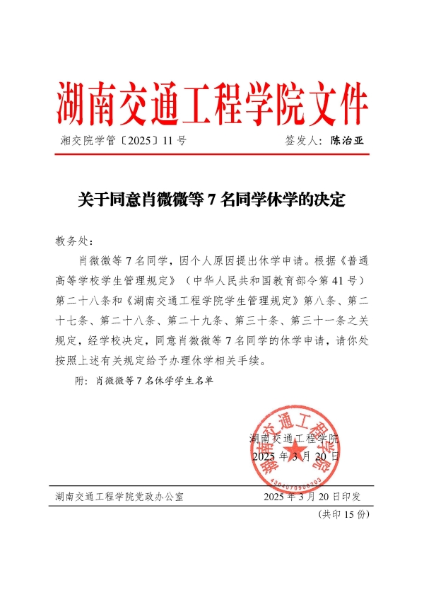 关于同意肖微微等7名同学休学的决定(湘交院学管〔2025〕11号)