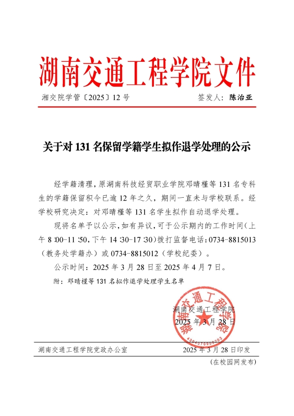 关于对131名保留学籍学生拟作退学处理的公示(湘交院学管〔2025〕12号)
