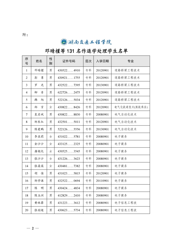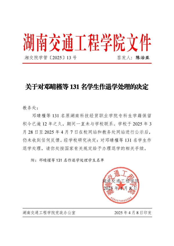 关于对邓晴槿等131名学生作退学处理的决定(湘交院学管〔2025〕13号)
